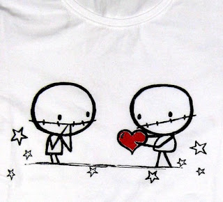 the first shirt i purchased was the "zombie lovers" design as can be seen below. i have *the* perfect items to go with it: black leggings, a gray, black & red plaid mini, a black cardigan, studded belt, and either black patent mary janes or black chucks... can you see how i fell for this little guy?